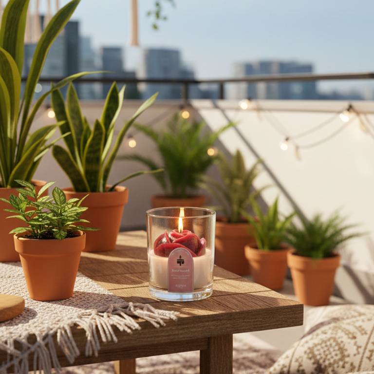 A single red rose sits gently on top of a creamy white candle, bringing a soft, romantic glow to any room.